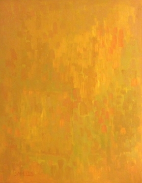 Homage to Something yellow-orange with rectangle, 2014, oil on masonite, 18x14”